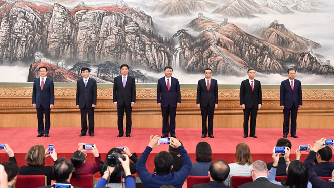 10月25日,黨的十九屆中央委員會第一次全體會議新選出的中央政治局常委同中外記者見面。