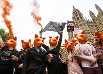 當地時間2015年7月14日,英國倫敦,動物保護者帶狐貍面具舉行游行示威,反對政府恢復狐貍捕殺法案。