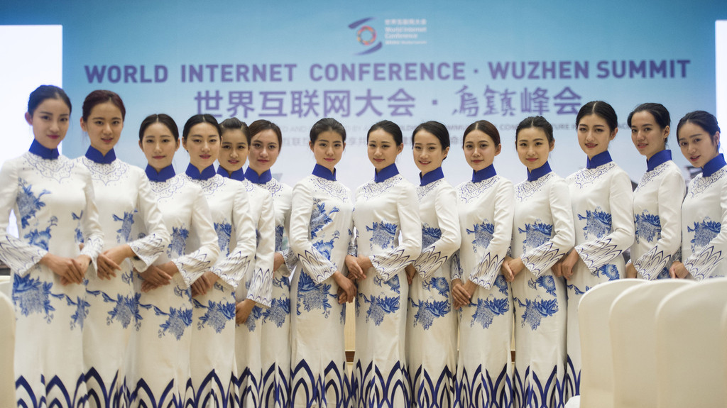 2015年12月13日,浙江烏鎮(zhèn)枕水酒店,浙江傳媒學院的大學生禮儀換上第二屆世界互聯(lián)網(wǎng)大會的青花瓷旗袍首次亮相。