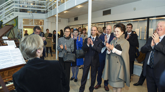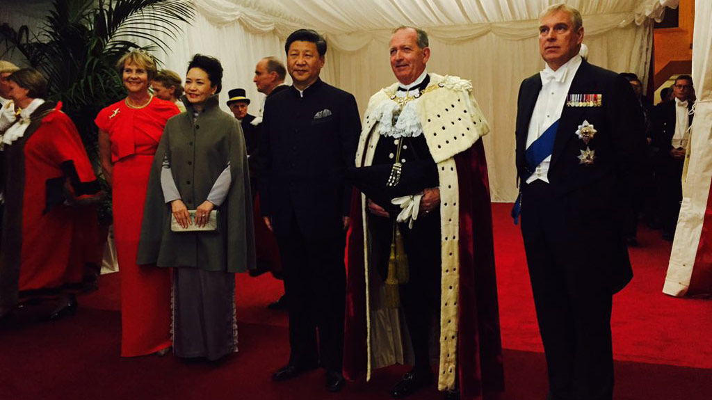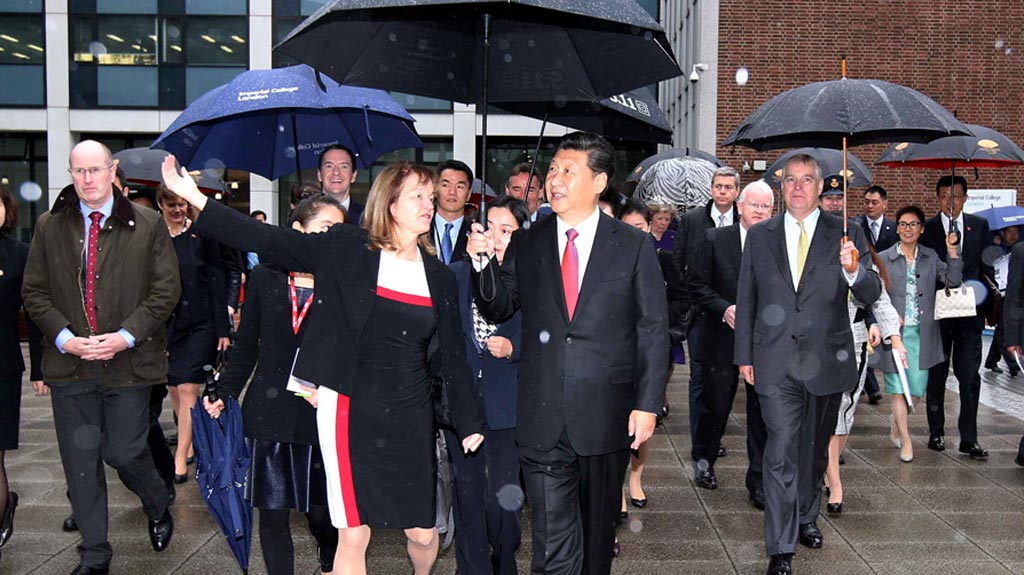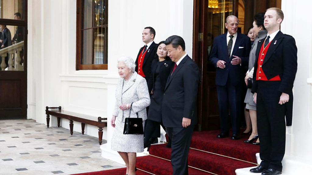 此訪是10年來中國國家主席首次對英國進行國事訪問。習近平和夫人彭麗媛在機場受到英國女王代表胡德子爵、外交大臣哈蒙德等熱情迎接。英國青年向習近平夫婦獻上鮮花。