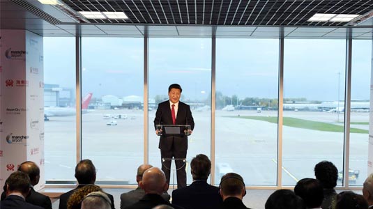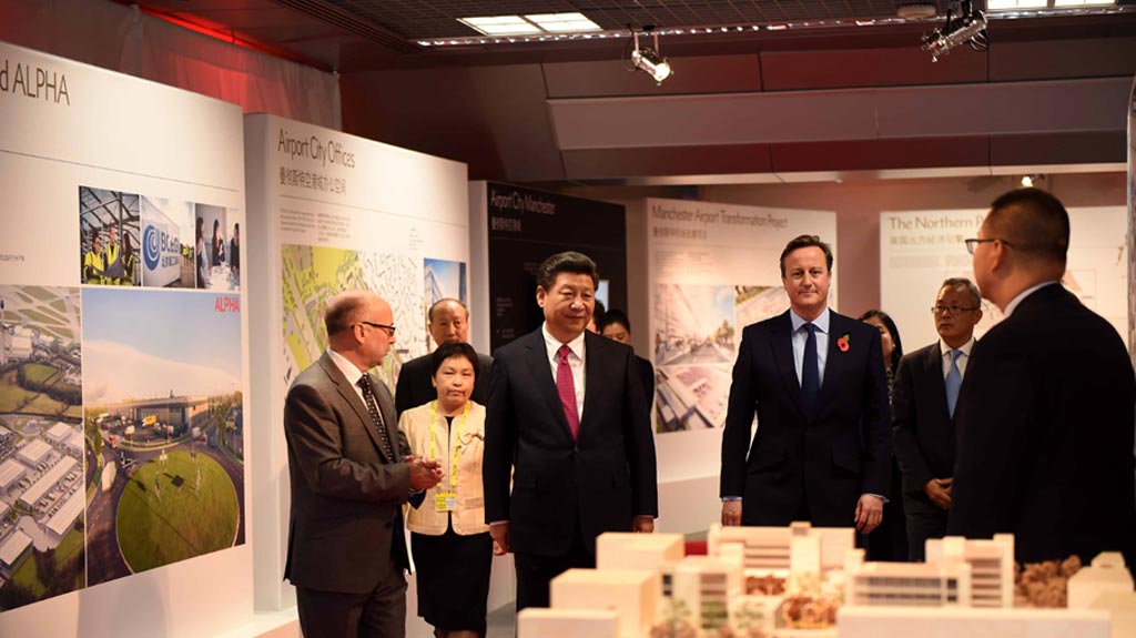 兩國領導人共同參觀曼徹斯特空港城發展規劃圖片展和空港城中國園模型,聽取中國海南航空公司北京—曼徹斯特航線開通情況有關介紹,并發表致辭。