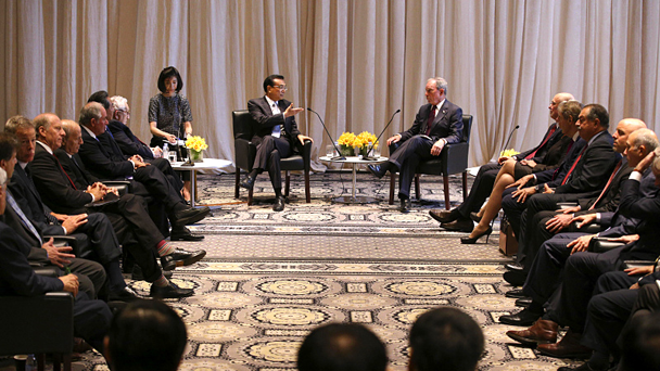 當地時間9月20日上午,李克強總理在紐約華爾道夫飯店與美國經濟金融界、智庫、媒體重要人士座談時,第一個向中國總理提問的是基辛格博士。” 李克強則在座談中對幾位參會者就中國經濟改革、經貿合作、人文交流、地區安全等方面提出的問題一一回應。