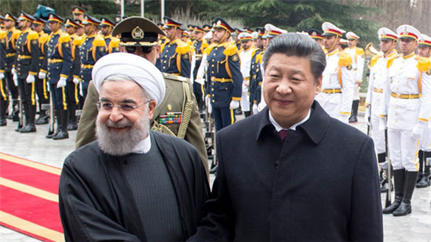 1月23日,國(guó)家主席習(xí)近平同伊朗總統(tǒng)魯哈尼在德黑蘭薩德阿巴德王宮舉行會(huì)談。