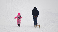 1月12日,在瑞士達(dá)沃斯,一對父女在雪坡上行走。
