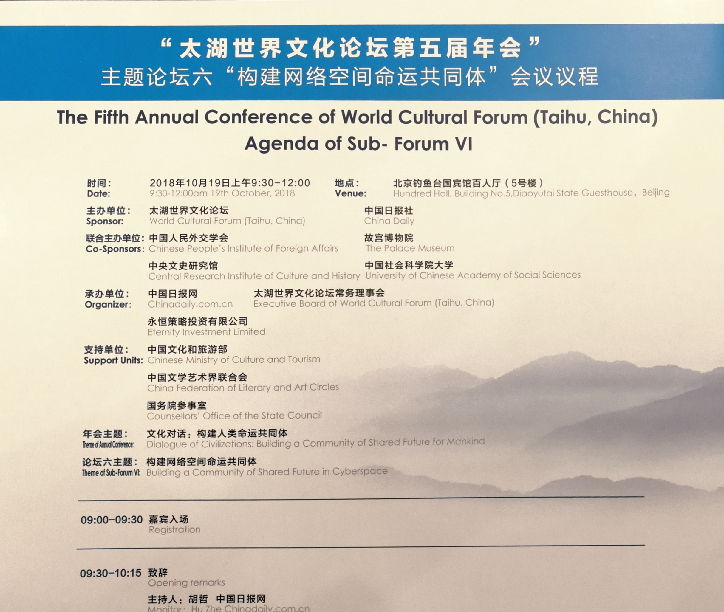 10月19日上午9:30,太湖世界文化論壇第五屆年會主題論壇六“構建網(wǎng)絡空間命運共同體”即將開始。