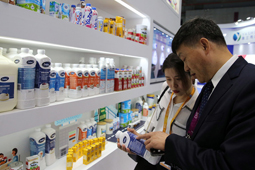 2018年11月7日,人們參觀進博會新西蘭恒天然展臺。中國國際進口博覽會11月5日在上海開幕,多家海外乳制品企業參展。