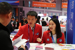 2018年11月7日,進博會現場,志愿者志愿者為觀眾解答問題。正在上海舉行的首屆中國國際進口博覽會總計招募志愿者超過5400人,他們參與進博會籌備工作和場館內外的各項服務保障,為進博會順利舉行和觀眾省心參觀作出貢獻。