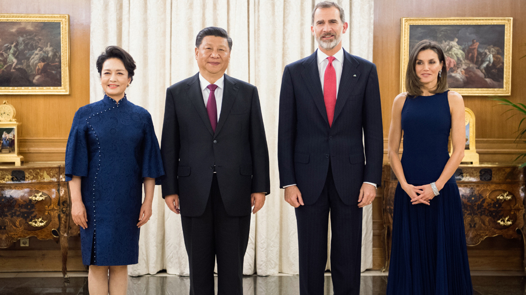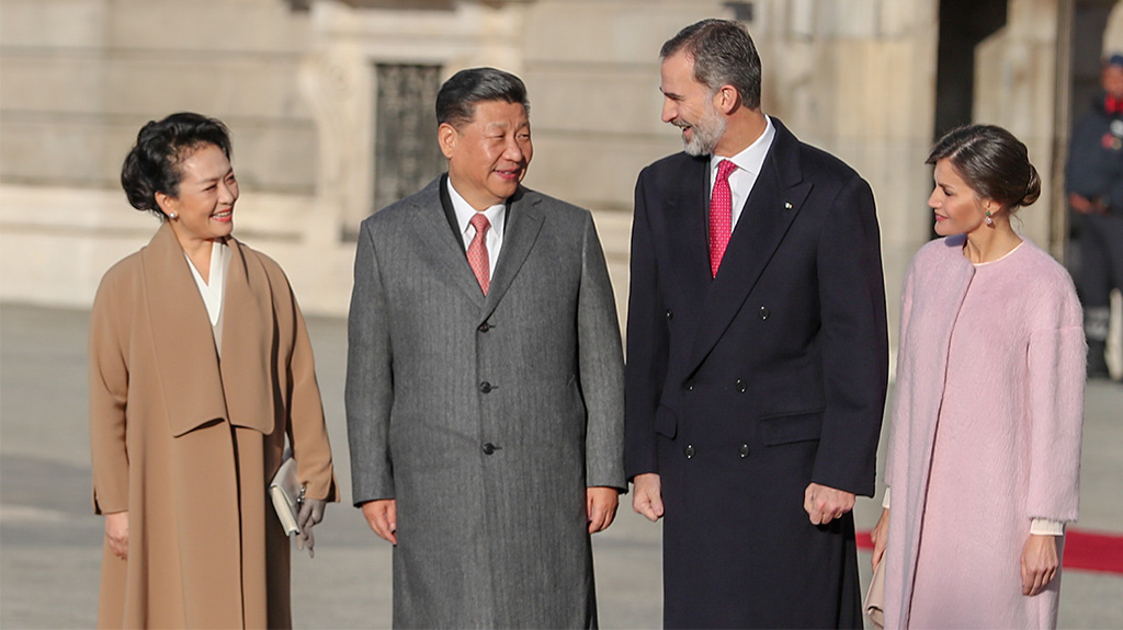 當地時間11月28日,國家主席習近平在馬德里出席西班牙國王費利佩六世舉行的隆重、盛大的歡迎儀式。習近平和夫人彭麗媛乘皇家禮車在身著禮服、騎著高頭大馬的西班牙皇家衛隊騎兵護衛下,前往武器廣場。
