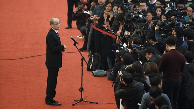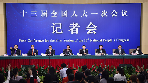 會議結束后,國家發展和改革委員會主任何立峰、國家衛生和計劃生育委員會主任李斌、水利部部長陳雷、國家工商行政管理總局局長張茅、中國銀行業監督管理委員會主席郭樹清、國務院港澳事務辦公室主任張曉明在“部長通道”接受采訪。