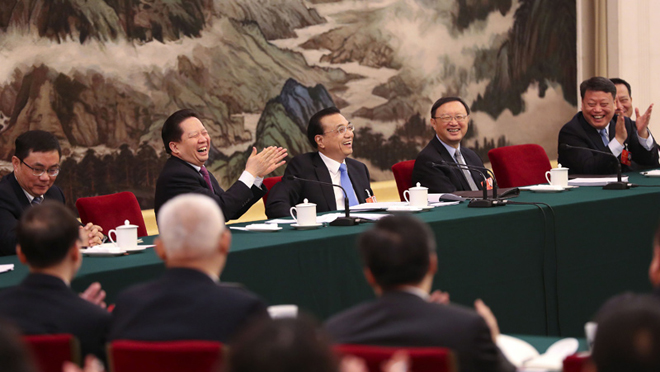 李克強總理3月12日來到十三屆全國人大一次會議湖南代表團參加審議。代表們就改革創新、中國制造提質增效、“互聯網+服務業”融合發展、有效降低企業杠桿率、精準脫貧攻堅、分享優質教育資源等提出十多條實實在在的建議。