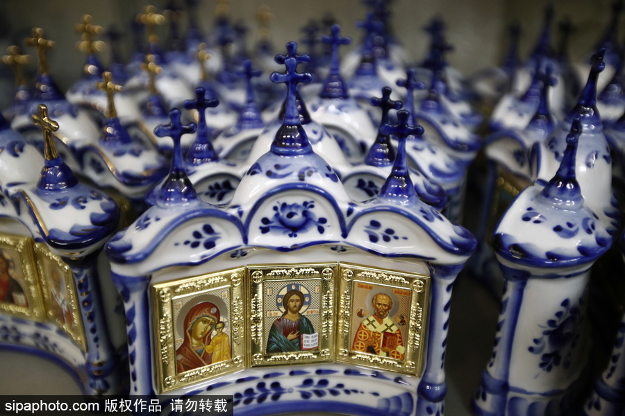 當地時間2019年1月16日,俄羅斯莫斯科,在俄羅斯莫斯科地區格熱利村的格熱利藝術繪畫廠生產和繪制的瓷器。自19世紀以來,格熱利一直是著名的陶瓷生產中心,這是一種相關的傳統俄羅斯陶瓷藍白色繪畫風格,和我國清朝的“青花瓷”有異曲同工之妙。