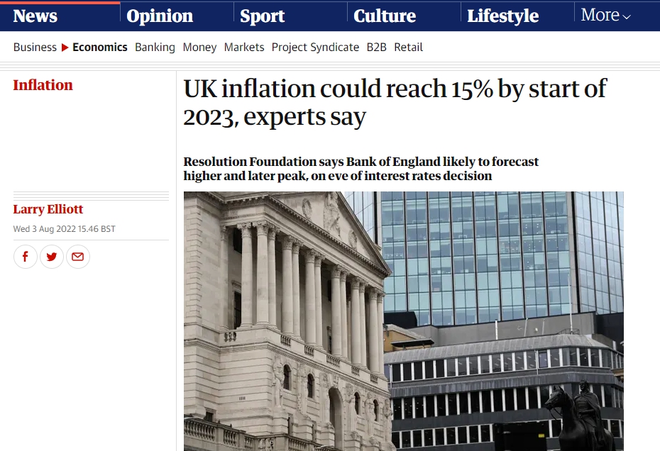 中國日報網8月25日電 據英國媒體《衛報》報道,由于能源價格大幅上漲進一步推高生活成本,有專家預測,至2023年初,英國年度通脹率可高達15%。