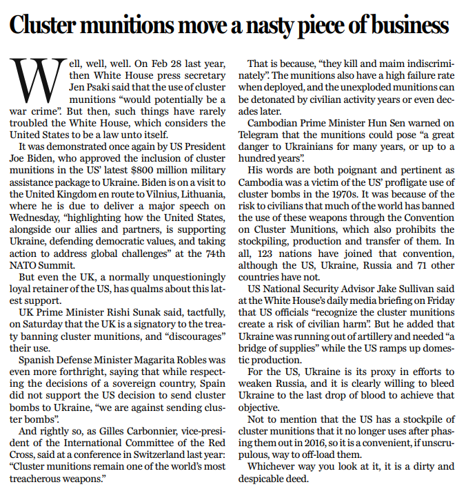 對美國來說,烏克蘭是削弱俄羅斯的代理人,為了這一目的,美國顯然愿意讓烏克蘭流盡最后一滴血。其次,美國擁有大量集束彈藥, 2016年起逐步淘汰一批,現在打著援助烏克蘭的旗號也是一種處理方式。因此,無論怎么看,這都是一種骯臟下流、卑鄙無恥的行徑。