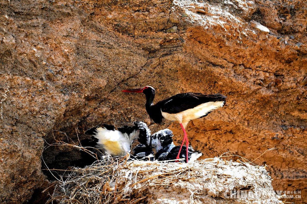 近日,祁連山國家公園甘肅省管理局酒泉分局鹽池灣保護(hù)站巡護(hù)人員在黨河峽谷監(jiān)測到國家一級保護(hù)瀕危鳥類黑鸛悉心哺育幼鳥的珍貴畫面。