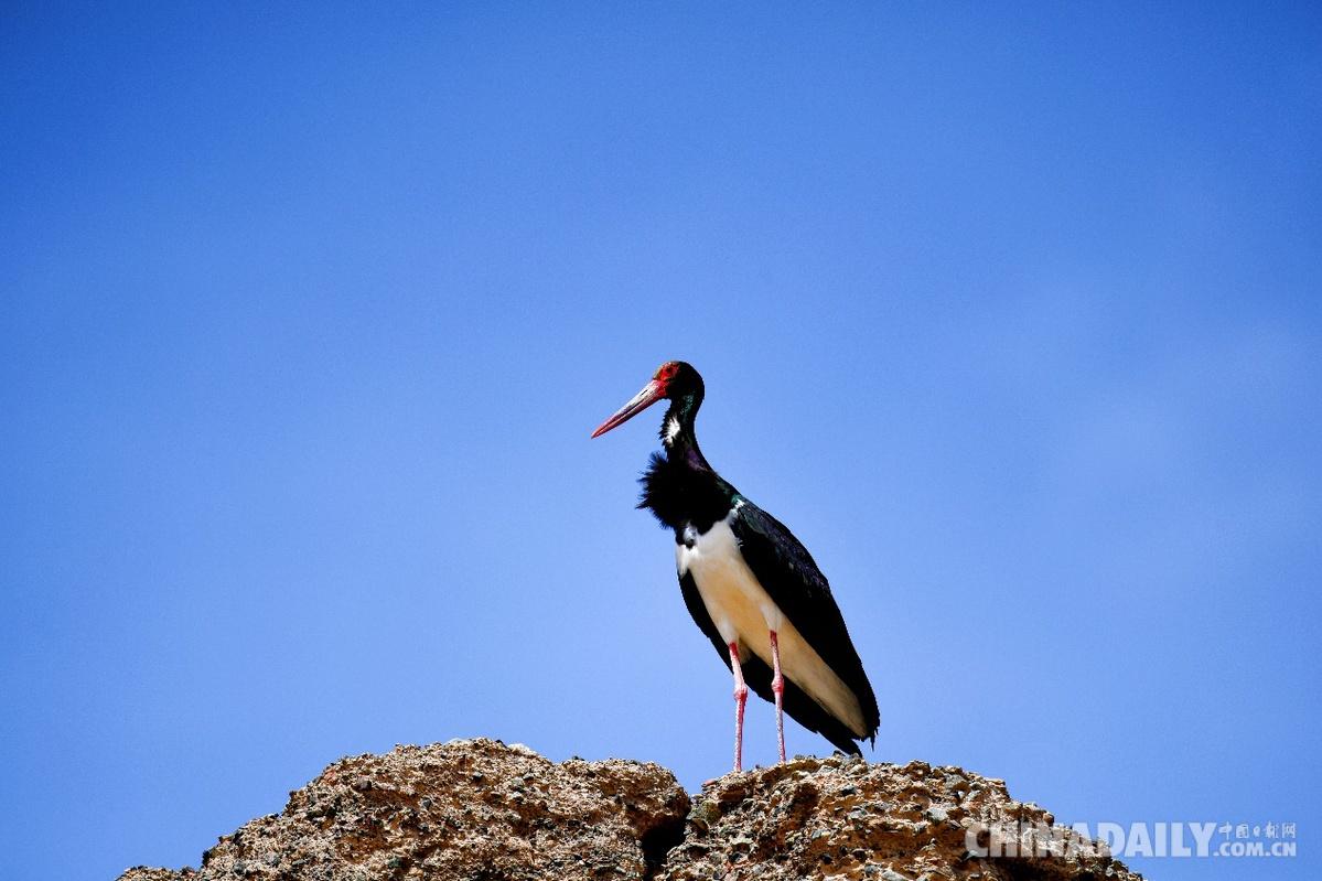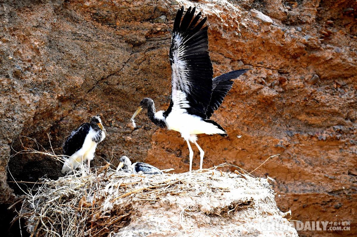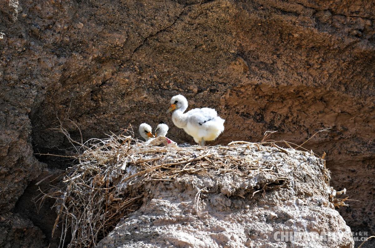 據(jù)保護(hù)站巡護(hù)人員介紹,黑鸛在祁連山境內(nèi)屬于夏候鳥,主要繁殖于河流兩岸、高山山頂裸巖的巖壁平臺上,每年4月下旬開始筑巢,7月中旬就可看到成鳥領(lǐng)著幼鳥覓食。此次監(jiān)測到黑鸛巢居并孵育雛鳥,是首次記錄到黑鸛繁殖。
