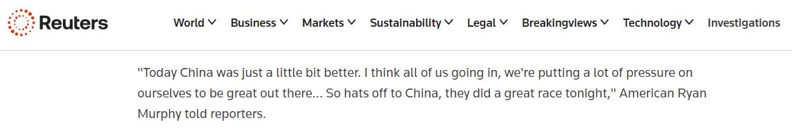 中國選手的優(yōu)異表現(xiàn)不僅贏得了獎(jiǎng)牌,也收獲了對(duì)手的尊重。據(jù)路透社報(bào)道,在男子4x100米混合泳接力決賽后,美國選手瑞恩·墨菲接受采訪時(shí)表示,“今天中國隊(duì)表現(xiàn)要更好一些……我要向中國隊(duì)致敬,他們今晚的比賽非常精彩。”
