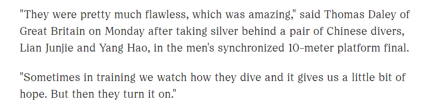 據(jù)美國國家公共電臺(tái)報(bào)道,英國選手托馬斯·戴利在雙人男子10米臺(tái)決賽中不敵中國跳水運(yùn)動(dòng)員練俊杰與楊昊,獲得銀牌。戴利表示:“他們的表現(xiàn)幾乎完美無缺,真是太棒了。有時(shí)在訓(xùn)練中,我們會(huì)觀察他們的跳水動(dòng)作,這給了我們一點(diǎn)希望。但隨后他們就反擊了。”