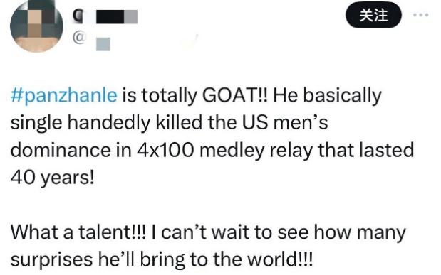 一位海外網(wǎng)友在海外社交媒體平臺(tái)X上大贊潘展樂,“潘展樂是偉大的游泳運(yùn)動(dòng)員……他真是個(gè)天才!我迫不及待地想看看他會(huì)給世界帶來多少驚喜!”