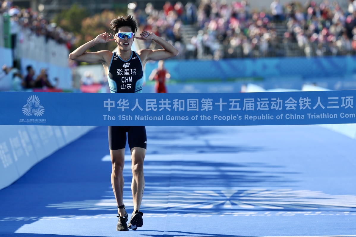 11月16日,山東隊選手張璽瑞沖向終點時慶祝。中國日報記者 魏曉昊 攝