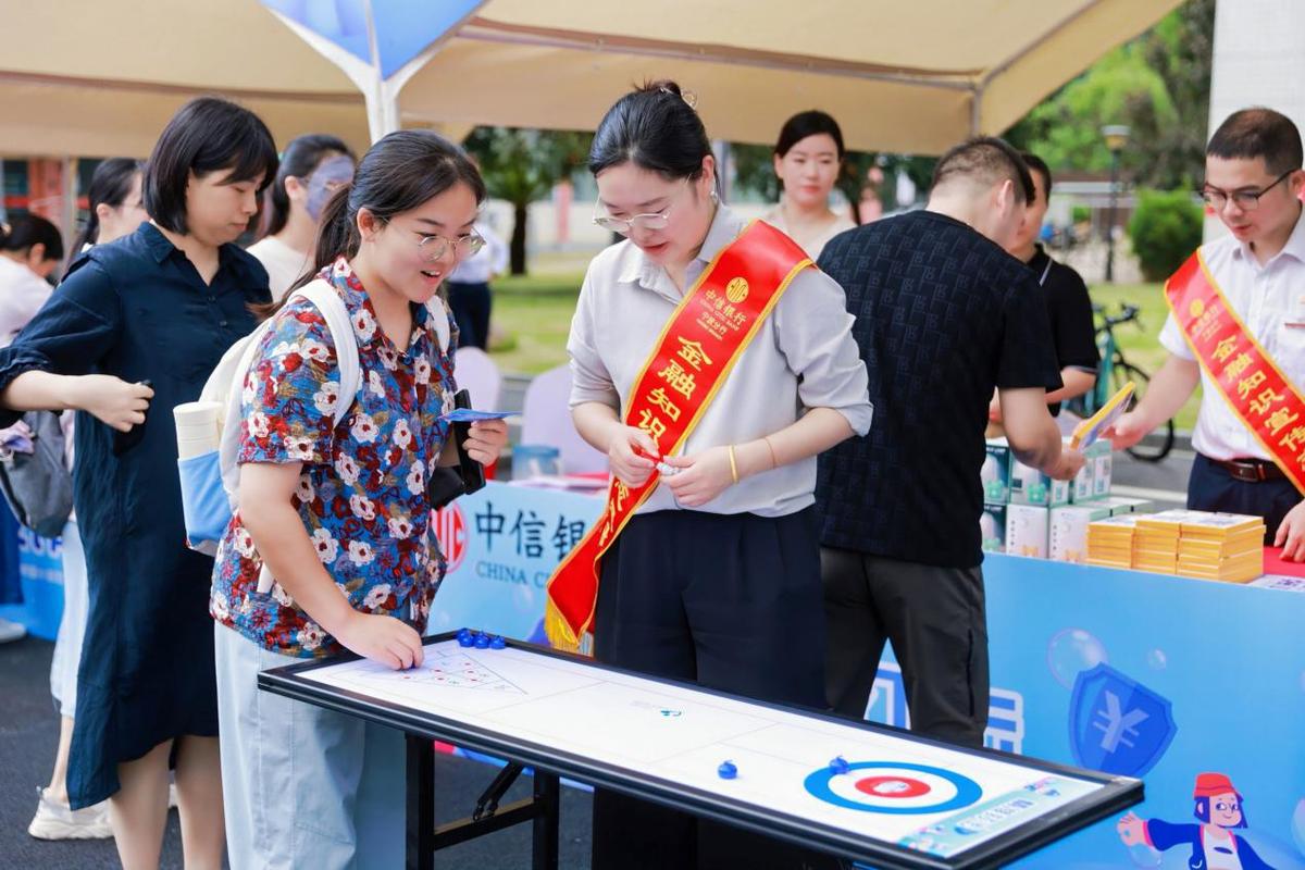 6月防范非法金融活動宣傳月期間,在金融監管部門的指導下,該行在鄞州區銀泰環球城辦“甬守錢袋安全”活動,三句半、AI數字人、防非大轉盤吸引眾多市民參與;鎮海支行聯合國家相關部門在吾悅廣場用“財富守護圈圈樂”游戲科普防詐;寧波大學游園會上,“擊穿騙局”“箭指騙影”互動,為千名大學生筑牢“校園貸”防范防線。