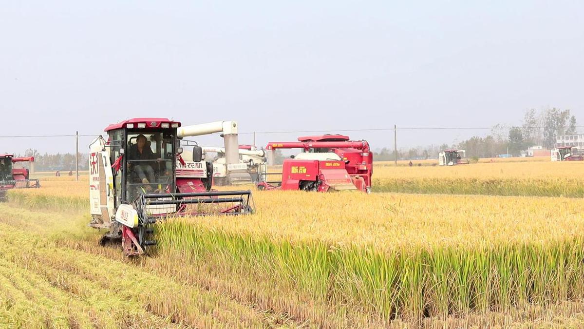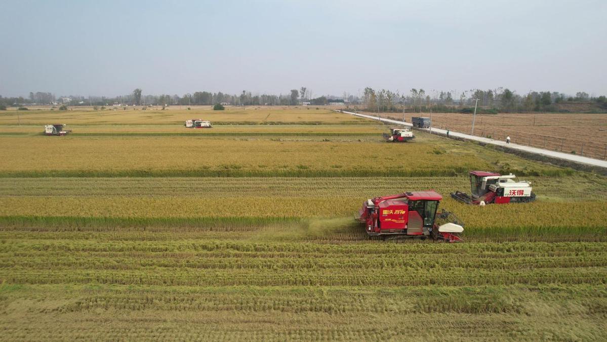 近日,河南省信陽市淮濱縣馬集鎮王樓農場的千畝優質粳稻進入集中收割期。遠遠望去,連片的稻田被染成金黃色,稻穗隨風搖曳,田間地頭一派繁忙景象。20余臺大型收割機開足馬力,在稻田里來回穿梭,“轟隆隆”的機器聲此起彼伏。收割機駛過之處,沉甸甸的稻穗被快速卷入機身,經過脫粒、清選后,顆粒飽滿的稻谷源源不斷地流入隨行的運輸車輛,不一會兒,一輛輛貨車便滿載著豐收的喜悅駛向曬場。