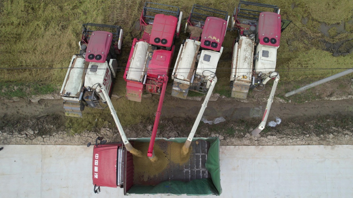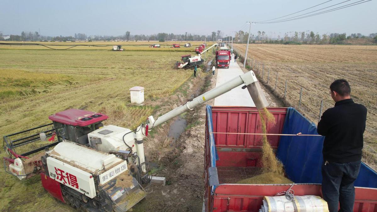 “今天幾塊地同時收割,一共安排了20多臺收割機、24輛拉糧車,忙得不行?!焙鷮氥y說道,“產量高的田塊每畝能收1200斤,平均下來也有1000斤/畝。價格方面,今年濕稻谷一斤能賣到1.2元,比去年略高一點?!?/p>