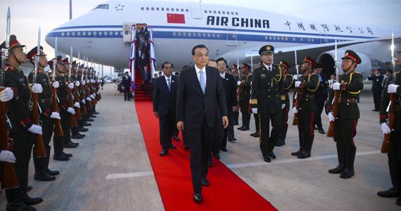李克強6日傍晚乘專機抵達老撾首都萬象瓦岱機場,出席東亞合作領導人系列會議并對老撾進行正式訪問。多位老撾政府高級官員到機場迎接。身著傳統服裝的老撾青年向李克強獻花。禮兵沿紅地毯兩側列隊行注目禮,向中國總理致敬。
