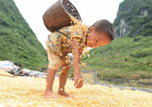 在廣西大化板升鄉弄勇村,7歲的藍桂景在幫忙家里晾曬玉米,他的家剛剛從山弄里搬到公路邊(8月7日攝)。新華社記者 黃孝邦 攝 在廣西大化七百弄鄉弄良村弄丘屯,讀初一的藍寶石在玉米地間騎著山地車玩耍(8月10日攝)。