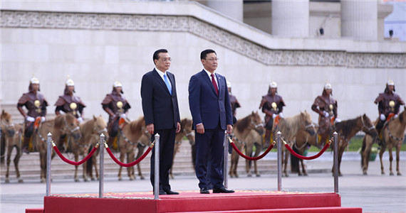 7月14日上午,蒙古國總理額爾登巴特在烏蘭巴托成吉思汗廣場舉行別具特色儀式,歡迎李克強總理來訪。