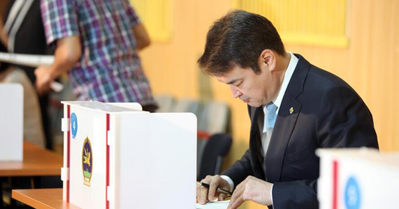 6月29日,在蒙古國(guó)首都烏蘭巴托,選民參加議會(huì)選舉投票。新華社記者鄭闖攝 6月29日,在蒙古國(guó)首都烏蘭巴托,蒙古國(guó)總統(tǒng)額勒貝格道爾吉在完成議會(huì)選舉投票后接受記者采訪。