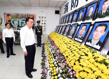 李克強(qiáng)16日下午來到天津?yàn)I海新區(qū)臨時(shí)靈堂,向“8.12”火災(zāi)爆炸事故中犧牲的消防人員默哀并三鞠躬。