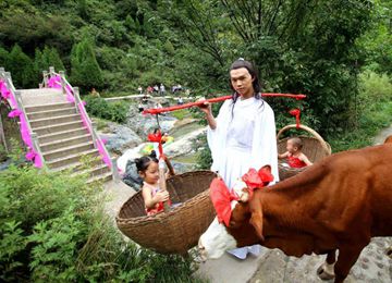 河南男女趕牛挑孩子 演繹現“牛郎織女渡鵲橋”