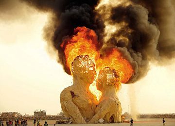 2014年“火人節”,所有“黑石城”的居民圍坐一起,燃燒一個10幾米高的木制雕像。(米粒) 2013年“火人節”,參與者們聚集在一處臨時搭建起的廟中。(網頁截圖) “火人節”上的一個木制造型。