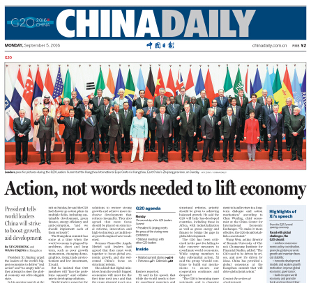 中國(guó)辦G20的目的,不是為了一己私利,而是為了更公平、更開放的世界經(jīng)濟(jì)秩序,這也是挽救世界經(jīng)濟(jì)的必由之路。