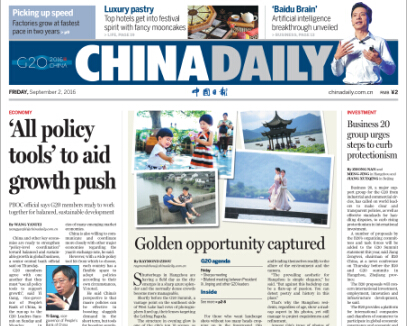 中國為杭州G20峰會制定了完美議程,這顯示出其非常重視這些經(jīng)驗。正如峰會主題明確指出的一樣,中國通過引領(lǐng)各國直面全球挑戰(zhàn),將能夠為全世界的經(jīng)濟(jì)、社會和環(huán)境繁榮作出重大貢獻(xiàn)。