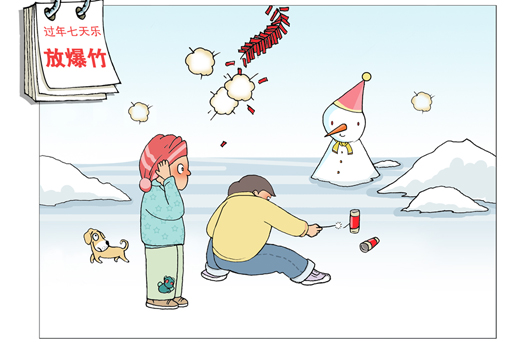 過年七天樂——放爆竹。中國民間有“開門爆竹”一說。即在新的一年到來之際,家家戶戶開門的第一件事就是燃放爆竹,以嗶嗶叭叭的爆竹聲除舊迎新,驅趕年獸。