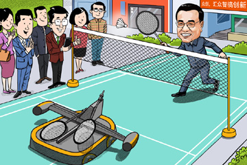 4月25日下午,李克強來到四川成都菁蓉創客小鎮,與創業者交流。總理應邀與創業團隊設計的羽毛球機器人“切磋”球技。
