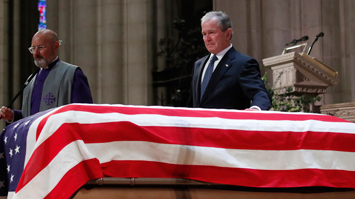 美國前總統老布什葬禮舉行 小布什致悼詞幾度哽咽輕撫靈柩