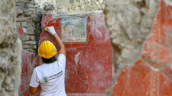 意大利龐貝古城精美壁畫遺跡出土 工作人員展開修復(fù)
