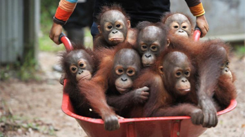 印尼猩猩幼崽坐手推車上學 擠作一團“萌萌噠”