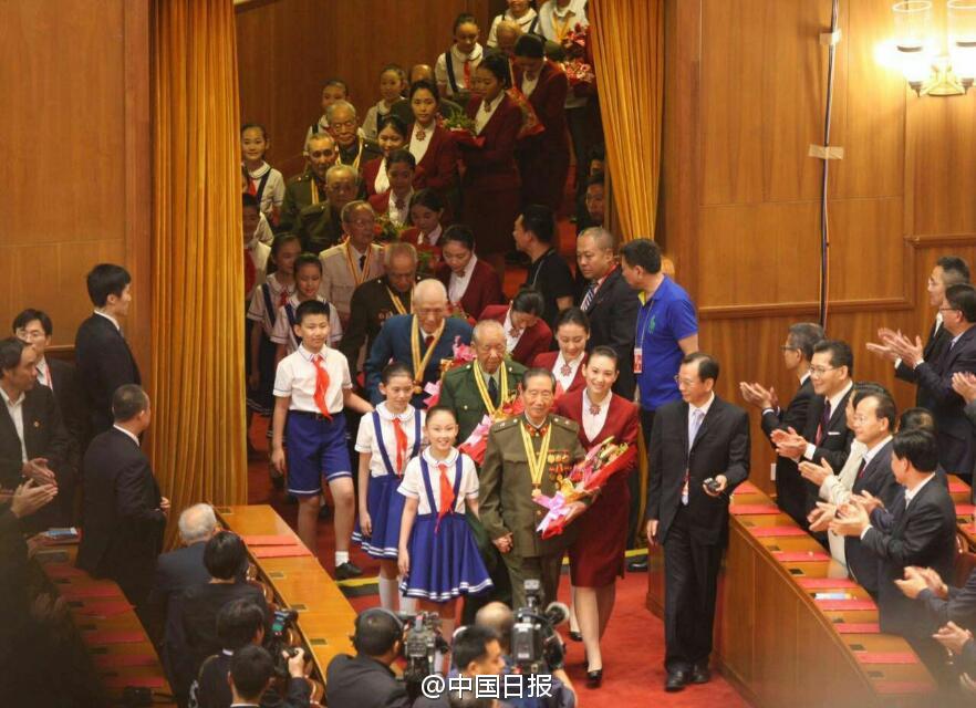 在紀(jì)念中國人民抗日戰(zhàn)爭暨世界反法西斯戰(zhàn)爭勝利70周年文藝晚會開演之前,70名抗戰(zhàn)老戰(zhàn)士緩緩步入人民大會堂,全體觀眾起立鼓掌,向他們致敬。(文字秦繼澤 攝影王壯飛) 在紀(jì)念中國人民抗日戰(zhàn)爭暨世界反法西斯戰(zhàn)爭勝利70周年文藝晚會開演之前,70名抗戰(zhàn)老戰(zhàn)士緩緩步入人民大會堂,全體觀眾起立鼓掌,向他們致敬。
