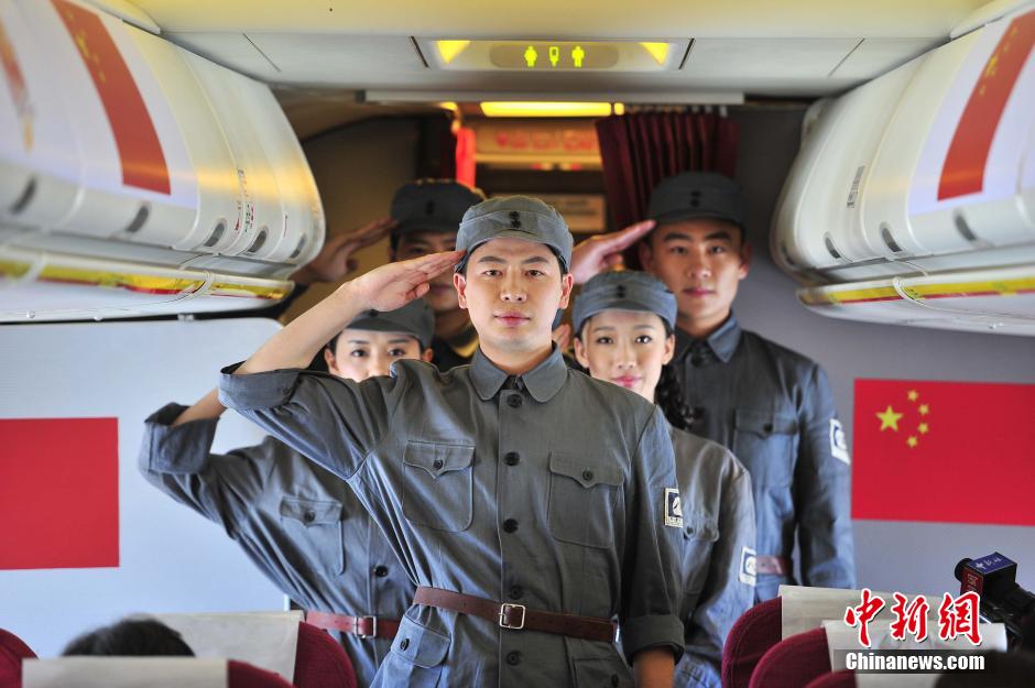 與往日不同,客艙登機(jī)口貼著醒目的抗戰(zhàn)勝利70周年紀(jì)念活動標(biāo)識,客艙行李架則由五星紅旗和抗戰(zhàn)勝利70周年紀(jì)念活動標(biāo)識共同組成兩道耀眼的“風(fēng)景線”,航班乘務(wù)組變裝為英勇抗戰(zhàn)的八路軍戰(zhàn)士。