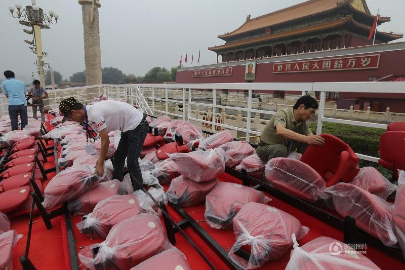 抗戰(zhàn)勝利70周年紀(jì)念大會(huì)昨圓滿結(jié)束,除受閱官兵,還有許多人在幕后默默奉獻(xiàn)。工人9月4日上午拆卸天安門廣場(chǎng)觀禮臺(tái)座椅,裝車運(yùn)走。截至記者發(fā)稿時(shí),人民大會(huì)堂和國(guó)博北側(cè)的座椅已拆除完畢。