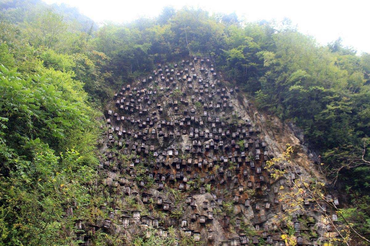 2015年9月4日,湖北省神農(nóng)架林區(qū)木魚鎮(zhèn)官門山一處峭壁上懸掛有數(shù)百個(gè)蜂箱,已成為當(dāng)?shù)氐囊坏榔嬗^。2015年9月4日,湖北省神農(nóng)架林區(qū)木魚鎮(zhèn)官門山一處峭壁上懸掛有數(shù)百個(gè)蜂箱,已成為當(dāng)?shù)氐囊坏榔嬗^。