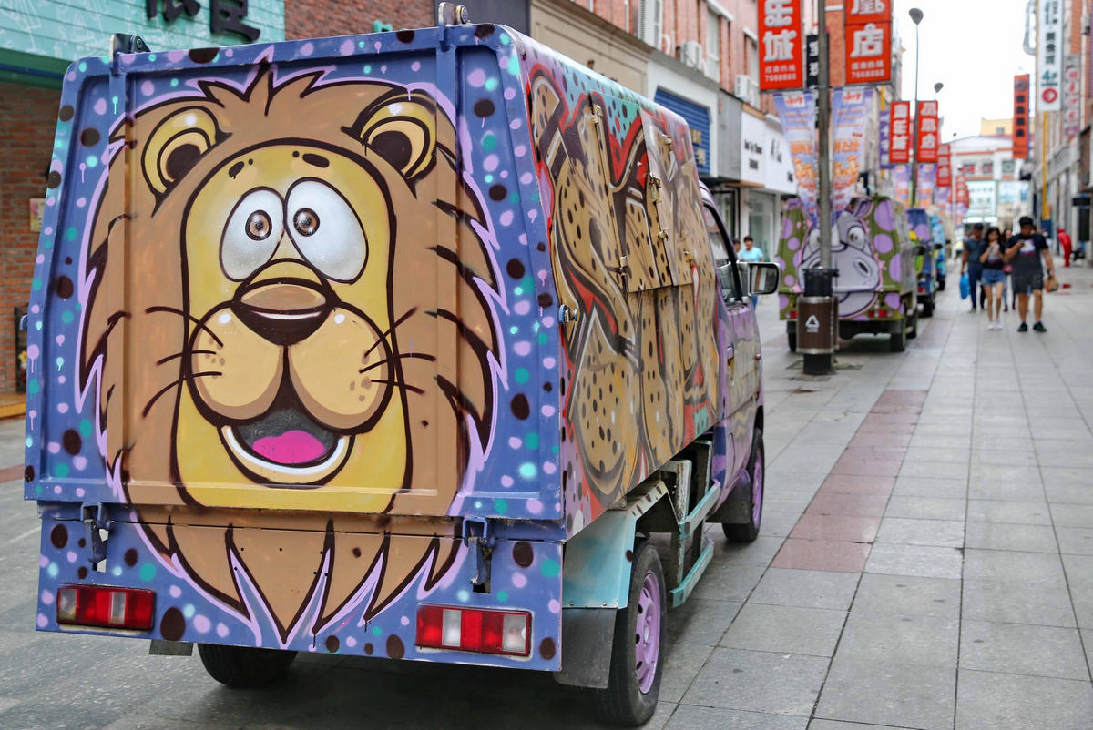 9月1日,河北秦皇島海港區(qū)拍攝的最美垃圾車。近日,秦皇島海港區(qū)太陽(yáng)城管委會(huì)將太陽(yáng)城的垃圾車以河馬、恐龍、獅子、犀牛等大嘴動(dòng)物為涂鴉創(chuàng)作題材繪制成一個(gè)快樂(lè)的動(dòng)物園。曹建雄/東方IC