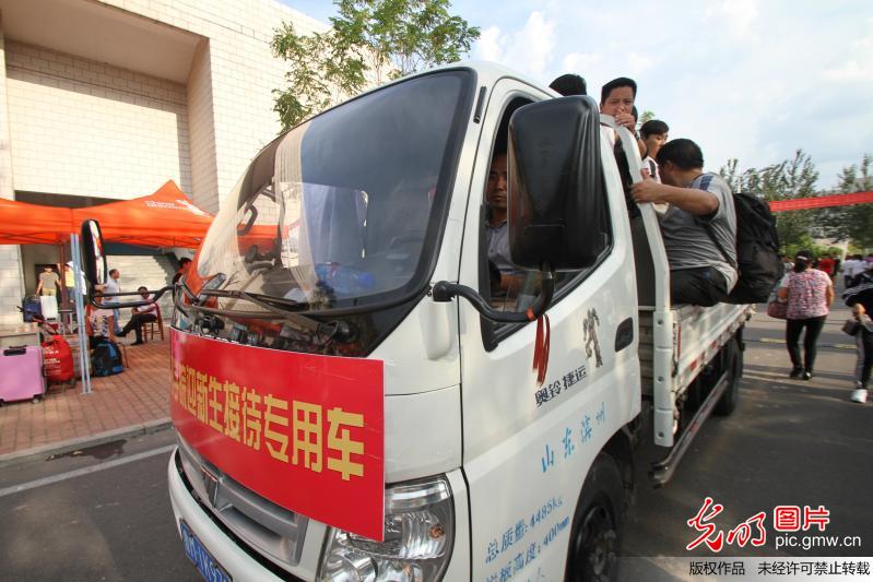 2015年9月4日,山東濱州一高校新生報(bào)到人海如潮,為及時(shí)疏導(dǎo)交通,校方出動(dòng)幾輛大卡車,輪番運(yùn)送學(xué)生及家長(zhǎng)。(梁寶海攝/光明圖片) 2015年9月4日,山東濱州一高校新生報(bào)到人海如潮,為及時(shí)疏導(dǎo)交通,校方在各個(gè)路口設(shè)立新生接待點(diǎn)。