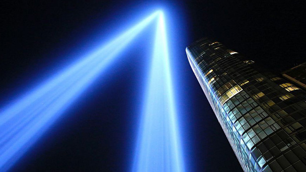 當地時間2017年9月10日,美國紐約,“9·11”紀念日前夕,兩根象征著在“9·11”恐怖襲擊中被毀的世貿雙子塔的光柱照亮夜空。