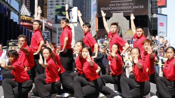 9月10日,數十名曾在國內外武術大賽上斬獲冠亞軍的運動員身著飄逸的傳統武術服,在有著“世界十字路口”的紐約時代廣場打起了太極