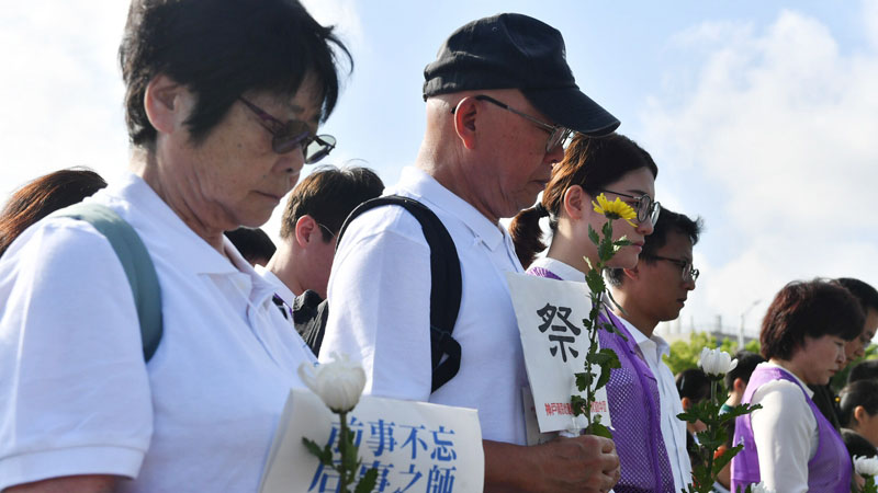 2018年8月15日上午,侵華日軍南京大屠殺遇難同胞紀(jì)念館在集會(huì)廣場(chǎng)舉行“升國(guó)旗、撞響和平大鐘”儀式化參觀活動(dòng)。