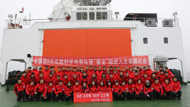 北京時(shí)間7月31日上午8時(shí)50分,“雪龍”號(hào)從北緯66°34′、西經(jīng)169°22′穿越北極圈,進(jìn)入北冰洋。
